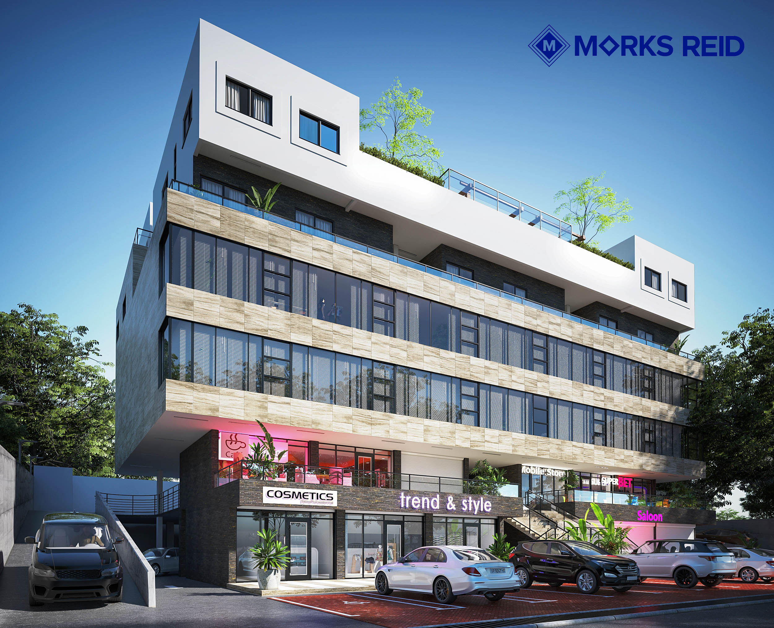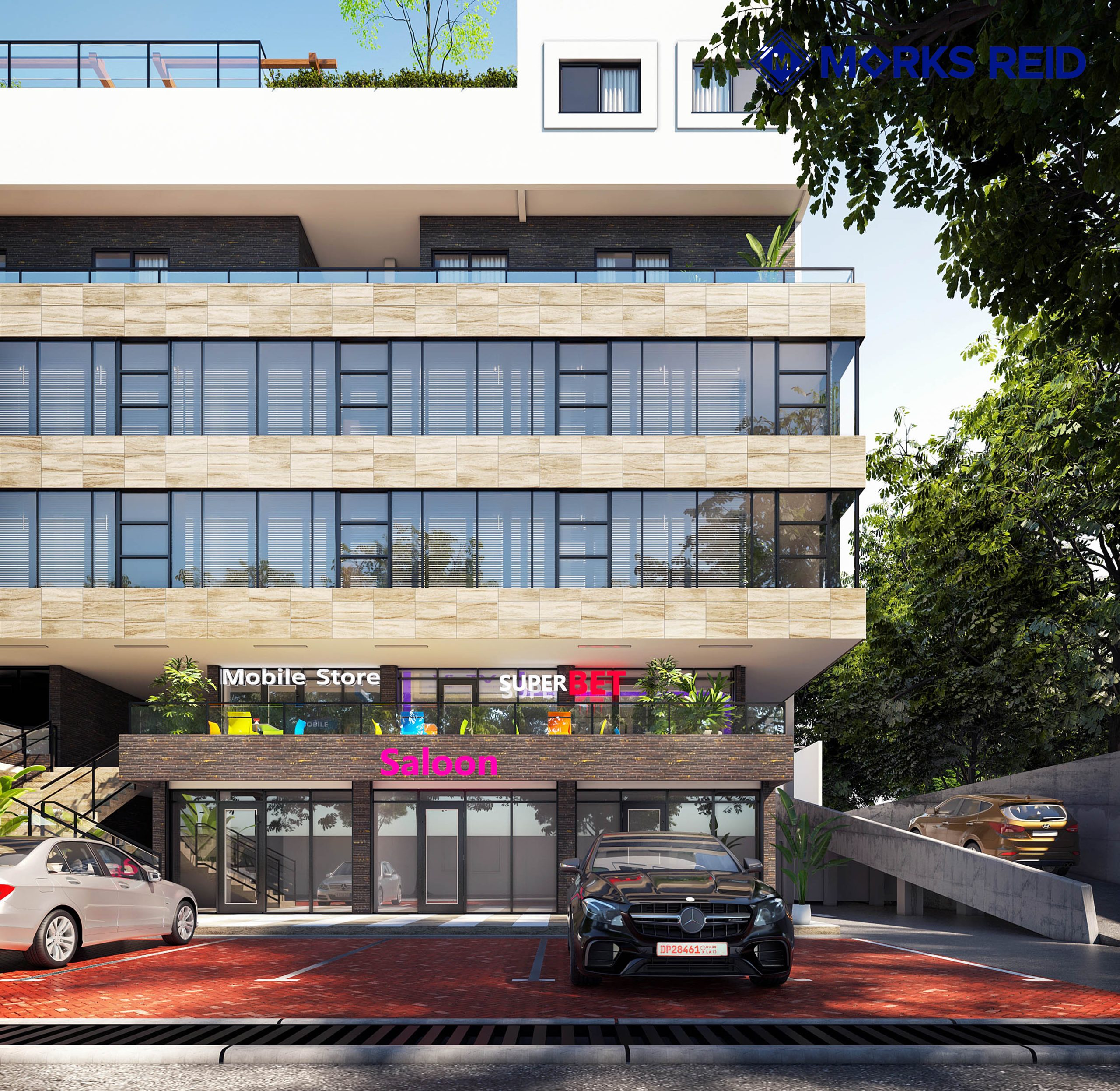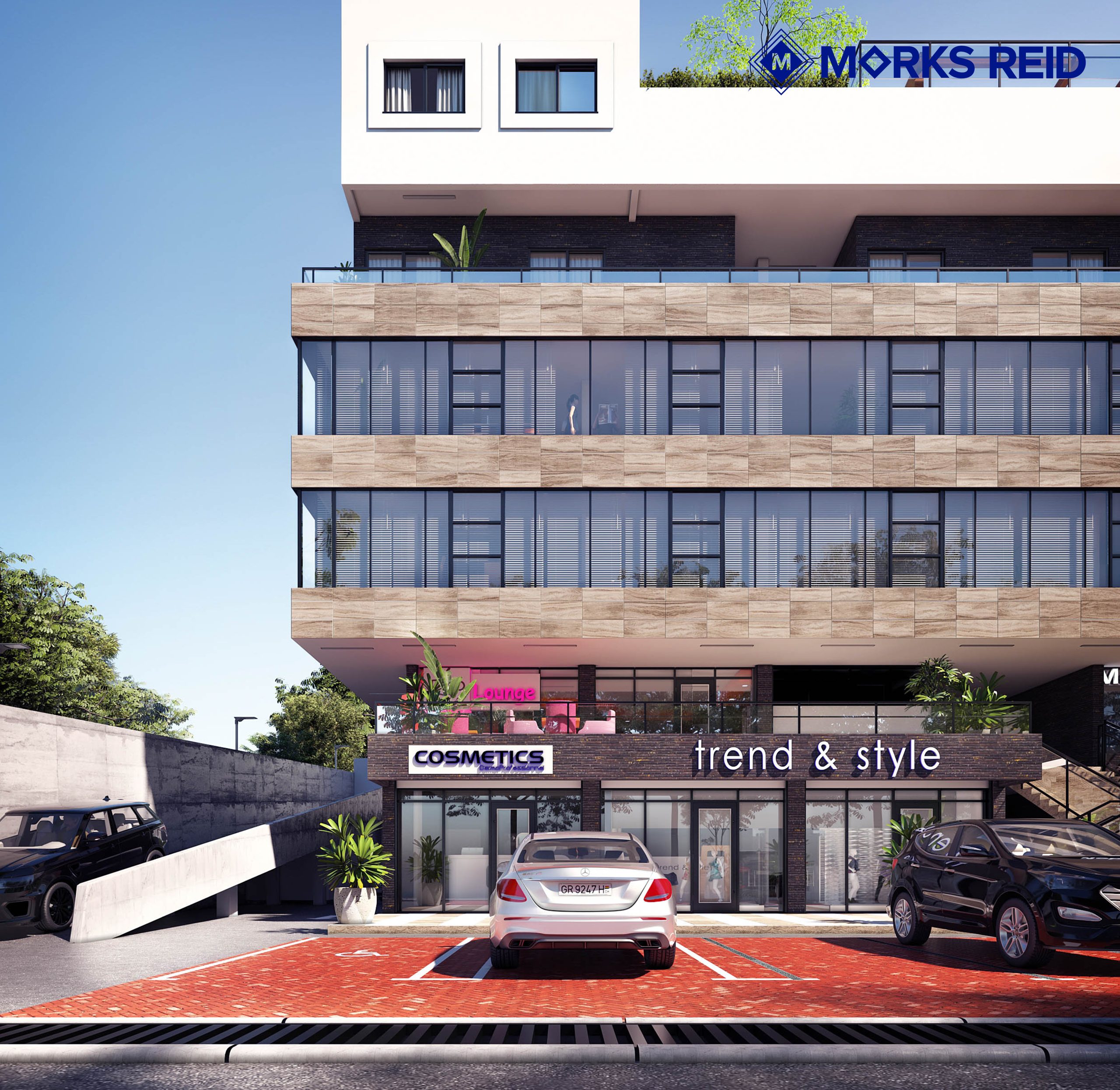 The building’s structure is simple and functional. Most of the parking was relegated to the rear portion of the structure to allow for greater volumes of human interaction at the front. Additional parking space was created on the first floor level connected by a concrete ramp to the level below. The first two levels host twelve large retail outlets with six outlets on each floor. Ample terrace space was provided in front of the first floor units to serve as an extension of the shop and a gallery. The gallery is connected to the ground floor by an elegant bifurcated staircase. The two upper floors levels above the retail outlets reserved for commercial purposes have 600 square metres each of open plan rentable space designed specifically for banks or large corporations. The fifth and sixth levels above host seven units of one-bedroom residential apartments and four units of two-bedroom residential apartments respectively with a large swimming pool on the last floor. Each apartment designed to accommodate the needs of a single family combines an extensive use of natural light, cross-ventilation and provides comfortable living areas. The main vertical access through the building connecting all the floors can be located at the centre of the structure in which the lifts together with an enveloping staircase was integrated into the building’s core.