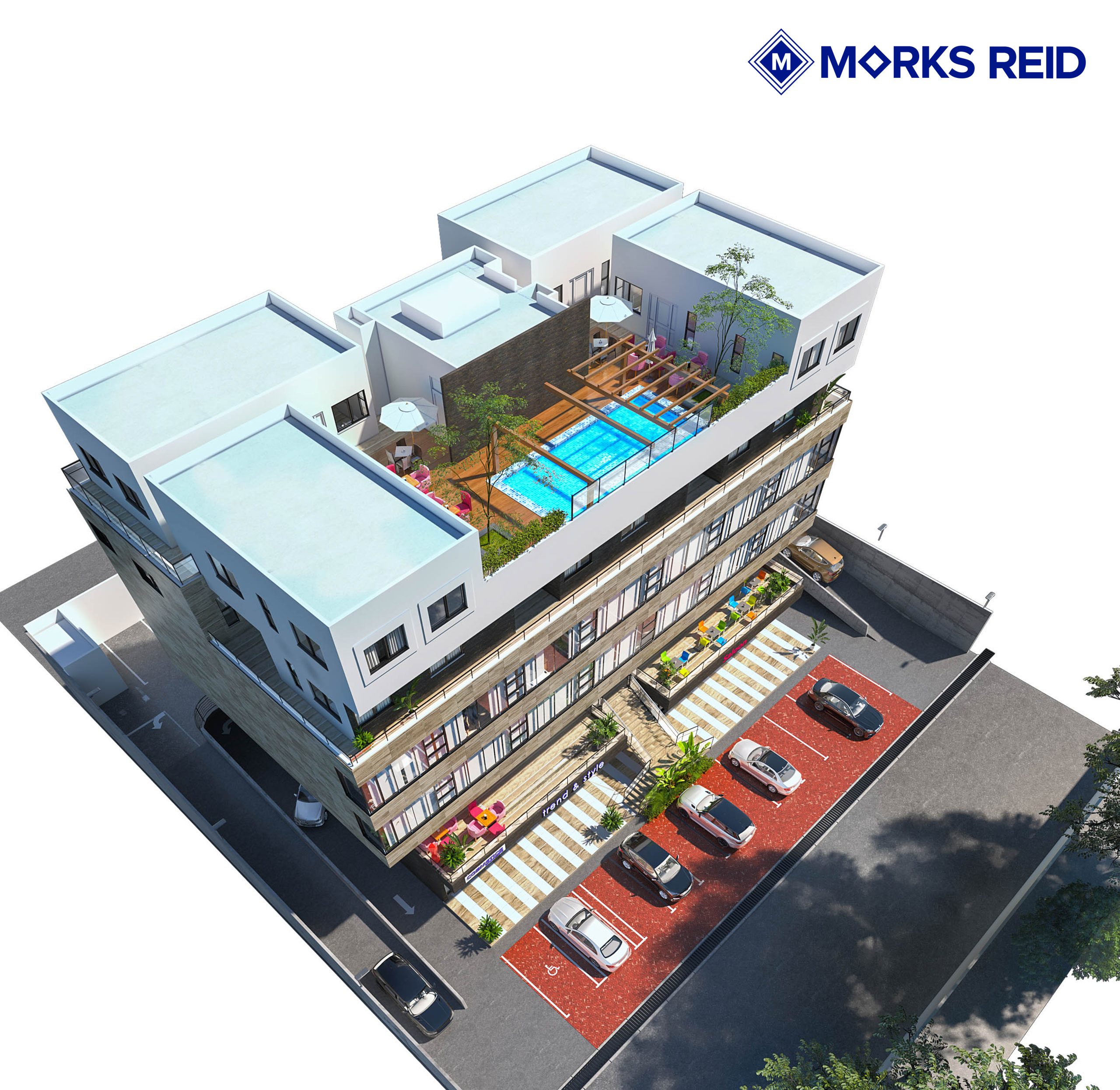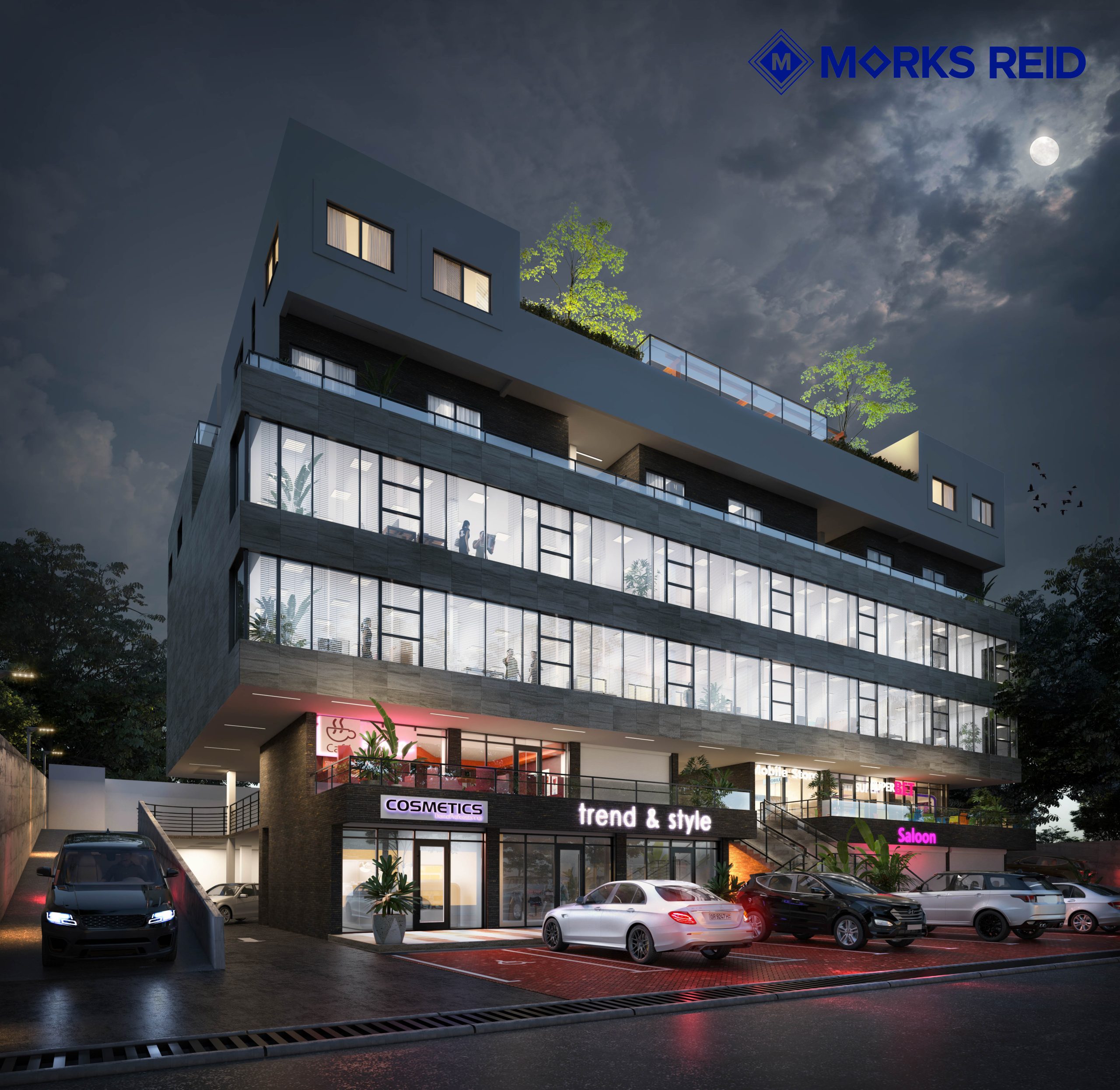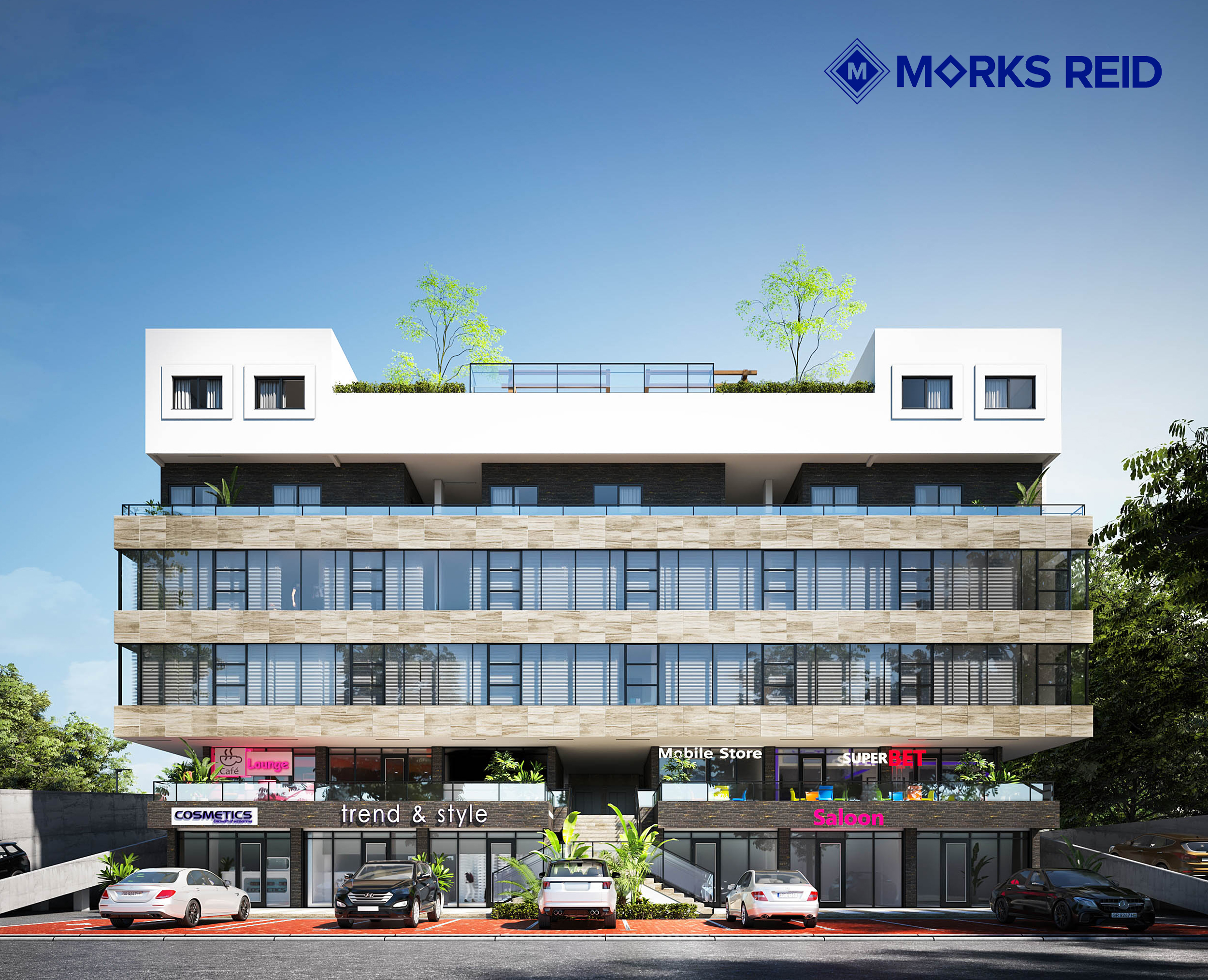 The building’s structure is simple and functional. Most of the parking was relegated to the rear portion of the structure to allow for greater volumes of human interaction at the front. Additional parking space was created on the first floor level connected by a concrete ramp to the level below. The first two levels host twelve large retail outlets with six outlets on each floor. Ample terrace space was provided in front of the first floor units to serve as an extension of the shop and a gallery. The gallery is connected to the ground floor by an elegant bifurcated staircase. The two upper floors levels above the retail outlets reserved for commercial purposes have 600 square metres each of open plan rentable space designed specifically for banks or large corporations. The fifth and sixth levels above host seven units of one-bedroom residential apartments and four units of two-bedroom residential apartments respectively with a large swimming pool on the last floor. Each apartment designed to accommodate the needs of a single family combines an extensive use of natural light, cross-ventilation and provides comfortable living areas. The main vertical access through the building connecting all the floors can be located at the centre of the structure in which the lifts together with an enveloping staircase was integrated into the building’s core.