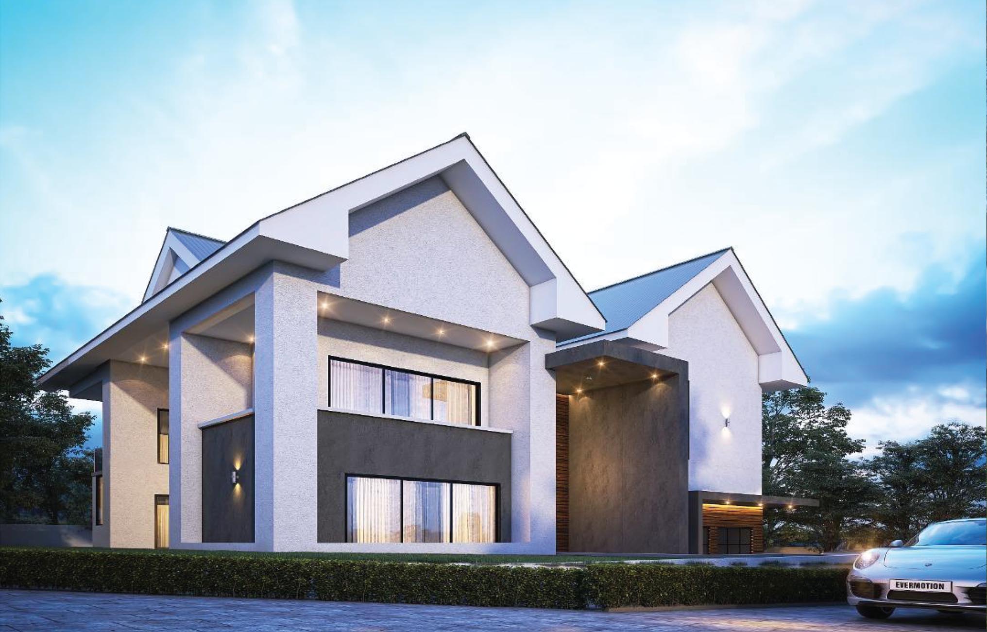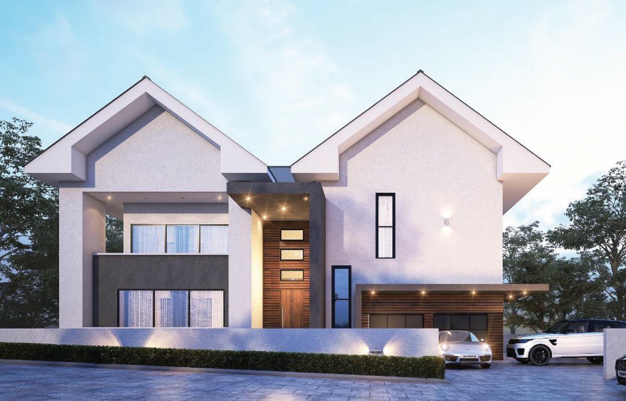 This project initially dubbed the serene home, evolved from a modest brief to a more contemporary 4 bedroom residence.  Sited within one of the top residential enclaves within Accra, the clients request was to provide a building that sits quietly amongst others yet pronounced in its outlook.   Whilst some argue that typical gabled roofs are mundane, our Lead Architect explored the idea of the simple intersection of two triangular shapes leading to the intersection ridges so as to create enough space that allows for vaulted ceilings or attics to be added on. Evidently this allowed for an innovative way to show an appearance of two separate buildings albeit connected.  To give the magnifying look, a variety of overhangs on the ground floor and around the building were deployed; combined with a  “Cross laminated like” timber  cladding to make the building appear distinguished.